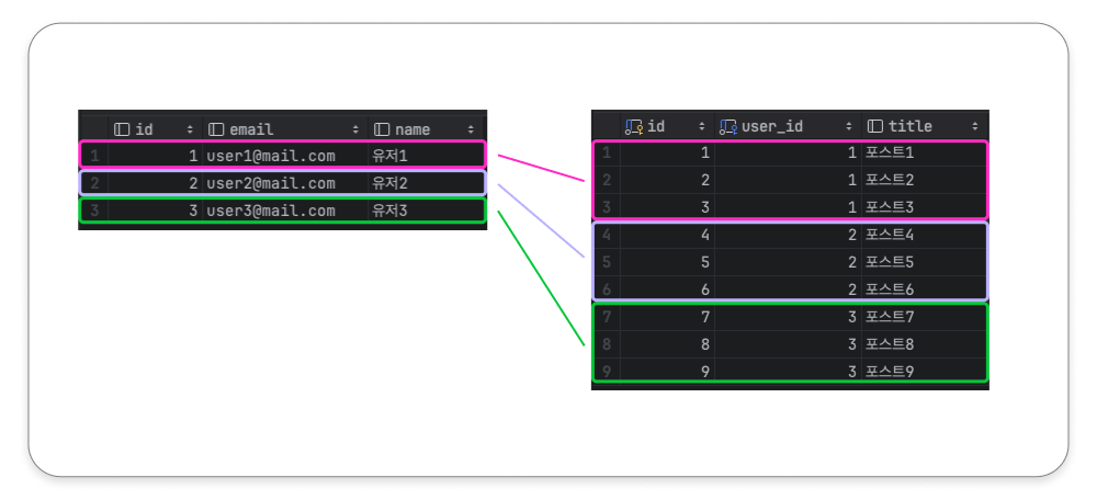 (이미지에 나온 것처럼 users 테이블에는 3명의 유저가, posts 테이블에는 user_id를 FK로 가지는 9개의 포스트가 들어 있다.)